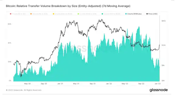 10M 以上的大单转账量,占据着市场较大的比重,目前达到 20%。