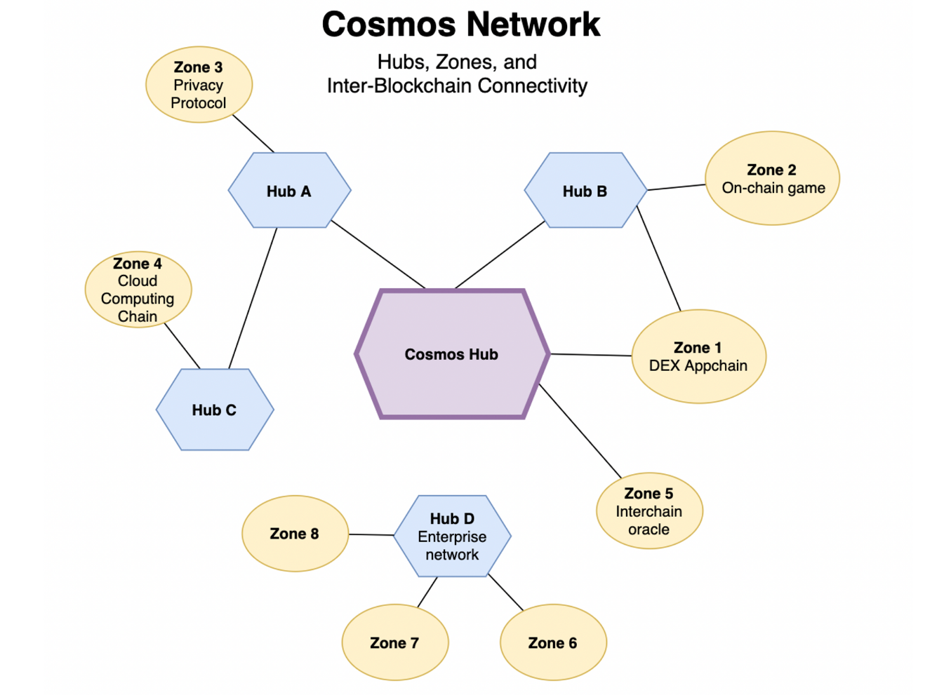 Cosmos网络中有两类区块链:“枢纽”(hubs)和“区域”(zones)。“区域”很好理解,即自己运行应用程序(如去中心化交易所或链上游戏)的针对应用程序的链。“枢纽”则会将这些“区域”与其他“枢纽”连接起来,以通过“区块链间通信协议”(IBC)实现链间通信。