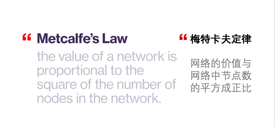 这就是市场这样的机制的运作方式。市场这个网络的参与者越多,发生有价值的商品和服务交换(作为社交产出的交易)的可能性就越大,网络的价值也就越大。