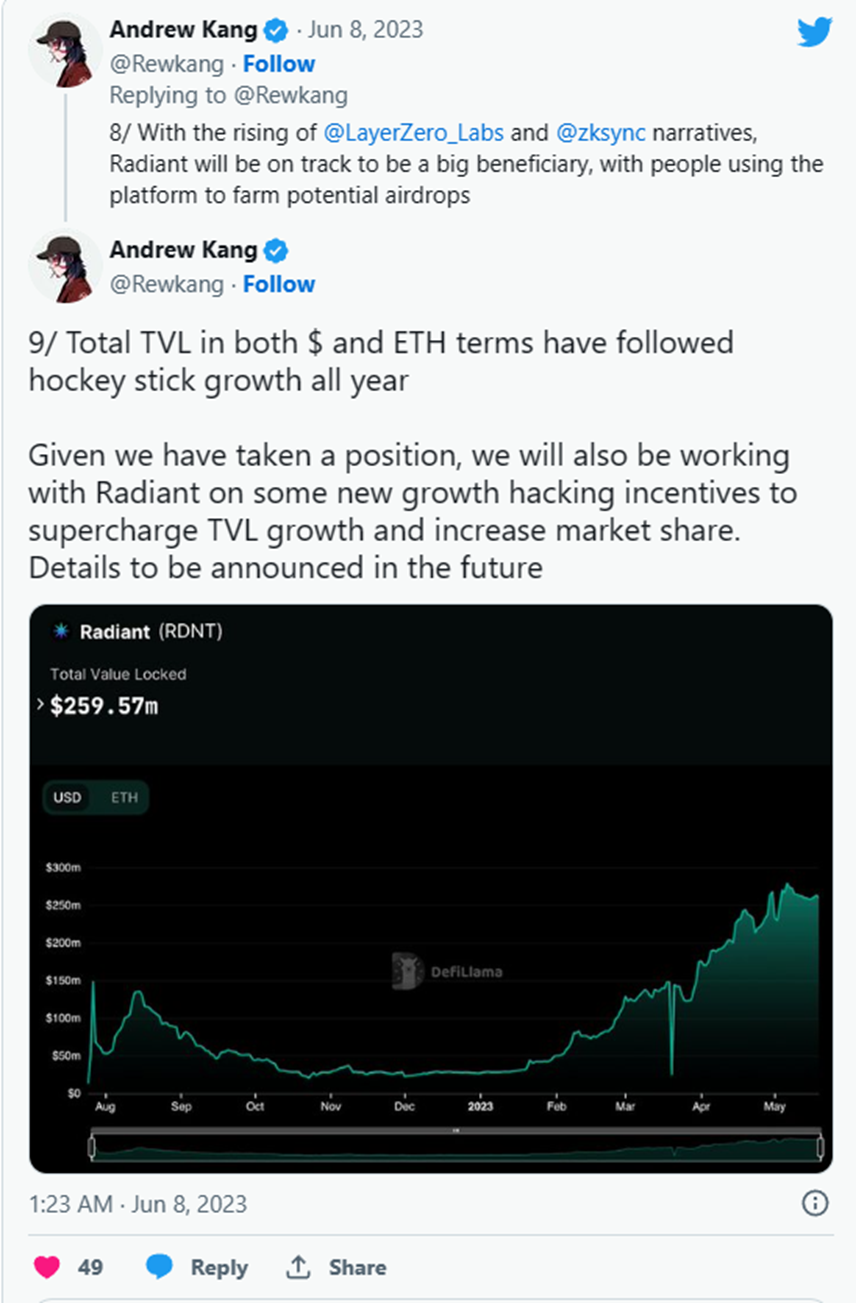 这些发展,加上他们富有远见的代币经济模型,帮助Radiant协议的总锁定价值(TVL)自2023年初以来增长了8倍以上。