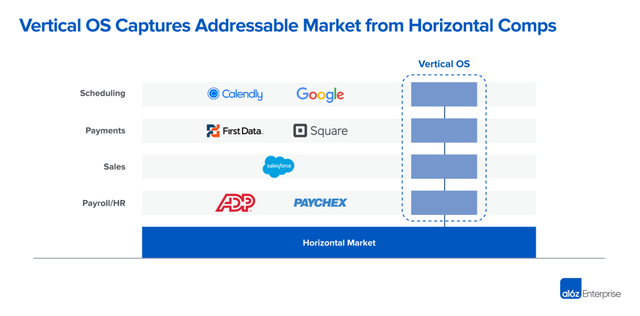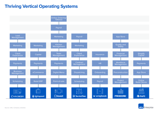 广义上讲,垂直市场被认为不如水平市场有吸引力,纯粹是由于市场规模。一般来说,对于记录系统来说,这无疑是真实的。但是,我们最喜欢的垂直操作系统的一个方面是,它们可以增加产品和服务,以缩小其水平竞争对手的总可寻址市场,同时也增加自己的可寻址市场。我们已经写了很多关于金融科技产品如何成为这些附加服务的文章,但正如我们的Quickbooks-Toast的例子所说明的那样,还有很多其他的软件产品可以被捆绑起来作为追加销售。例如,虽然Toast以其销售点终端和订购系统而闻名,但它也提供工资单、厨房管理、团队管理和其他软件模块。从理论上讲,这些产品中的每一个都可以缩小横向竞争者在这些细分市场的可寻址市场,如用于支付工资的Gusto。