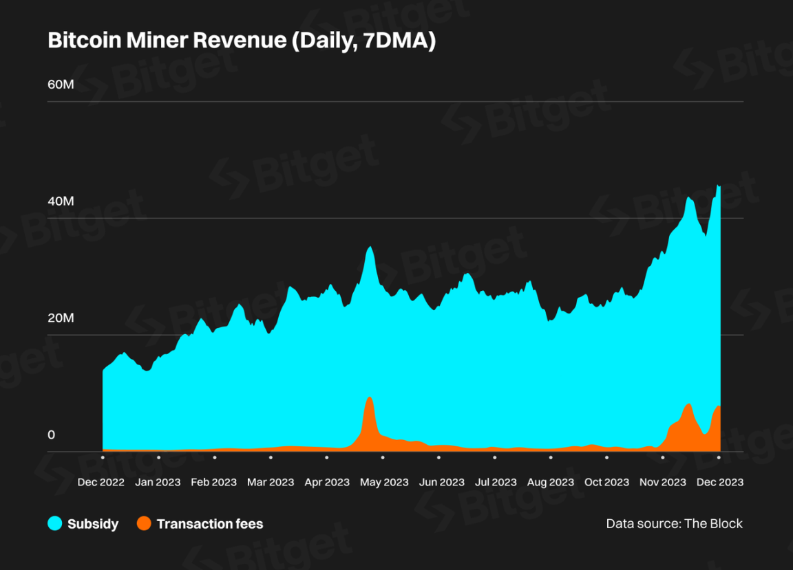 - 矿工收入增加:随着 BTC 的生态繁荣,尤其是 BRC-20 代币的炒作热情高涨,网络需要记录的信息更多,这需要给予矿工更多的手续费。这导致了 Bitcoin 矿工的收入水平近期连创新高,主要是交易手续费的部分增加。