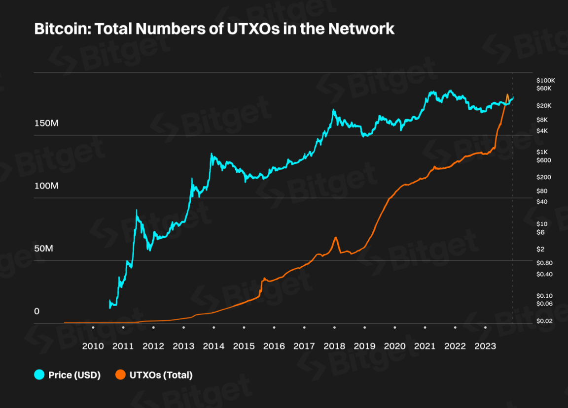 - 区块链空间的使用效率会下降:Ordinals 通过在比特币的单个交易中嵌入数据来工作,这可能会占用大量的区块空间。这会导致矿工需要存储比特币网络 UTXO 信息体量暴涨,而且会影响网络的处理速度和交易成本。