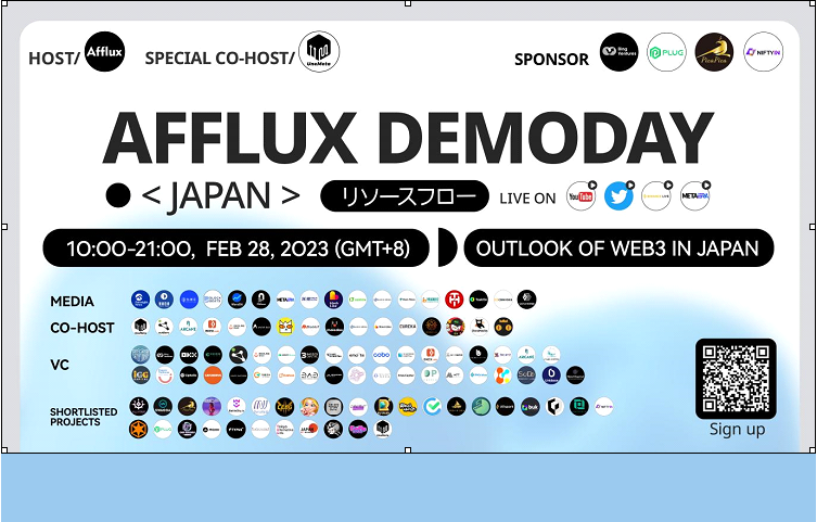 由Afflux主办,Plug Chain、Bing Ventures、PicaPica和NIFTYIN赞助,日本第一风险投资机构Skyland、日本第一NFT公司UneMeta倾力相助,数十家Web3风投机构、媒体、协办支持的Web3日本专场路演即将在2月28日正式开启,来自全球各地的31个项目入围赛场、下一个点爆日本Web3市场的项目即将诞生!