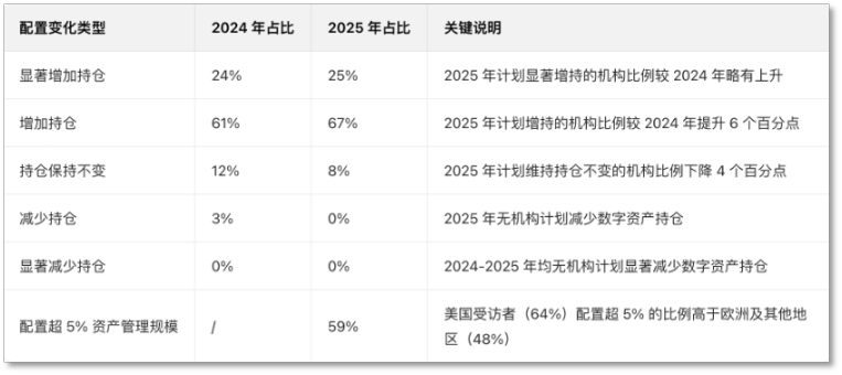 根据安永 -Coinbase 联合发布的《2025 年机构投资者数字资产调查报告》显示,资产管理公司、对冲基金、私人银行、风投基金、家族办公室等在资产配置决策有影响力的机构投资者,都对加密资产产生了浓厚的兴趣。报告指出 86% 的受访机构投资者已持有数字资产敞口,并计划在 2025 年后进一步扩大配置。
