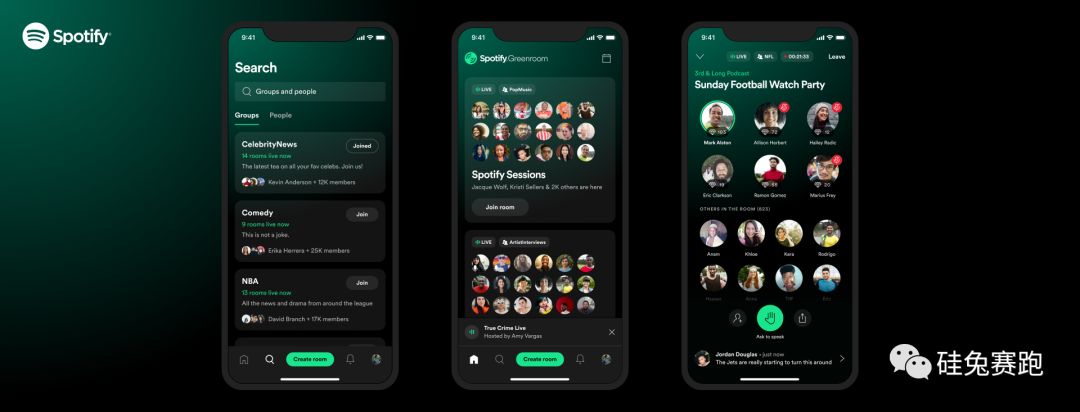 Spotify也在同月推出了自家的Clubhouse竞品 - Greenroom,是基于此前收购的体育音频内容app Locker Room而成,来自全球的用户都可以创建和参与语音聊天室,还可以将对话生成为播客。