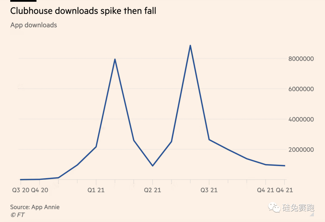 在Clubhouse正式推出一年后,周活跃用户数突破了千万大关,但总用户数却逐渐开始有下滑的趋势。