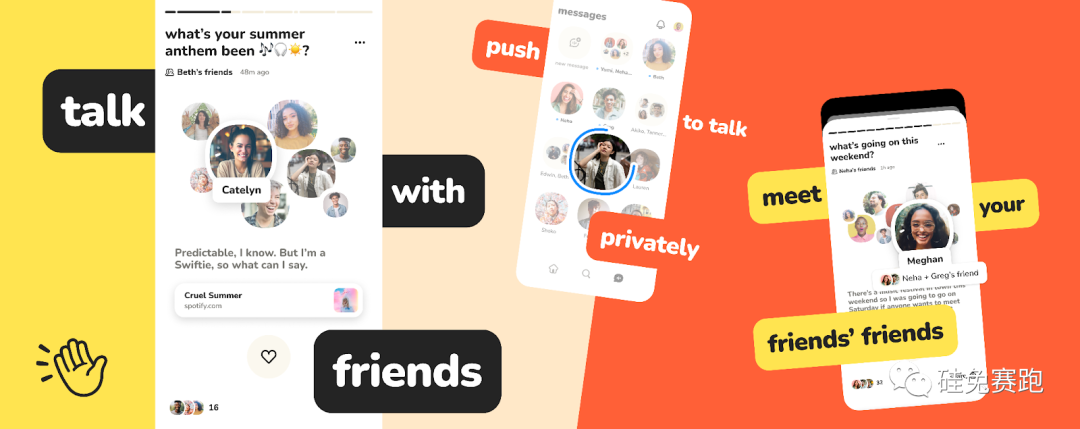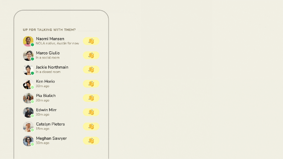 比如和TED进行合作在语音聊天室内进行独家演讲内容的播送,跟Stripe合作让Clubhouse上的内容创作者可以赚钱,在2021年9月推出了叫做“Wave”的招手功能,让用户可以通过点击“👋”的emoji快速邀请好友加入语音聊天,鼓励更加随性和自然的社交行为👇
