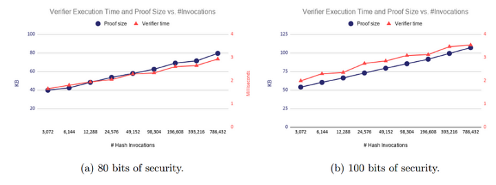 不同级安全性下验证时间和证明大小与哈希调用线性图