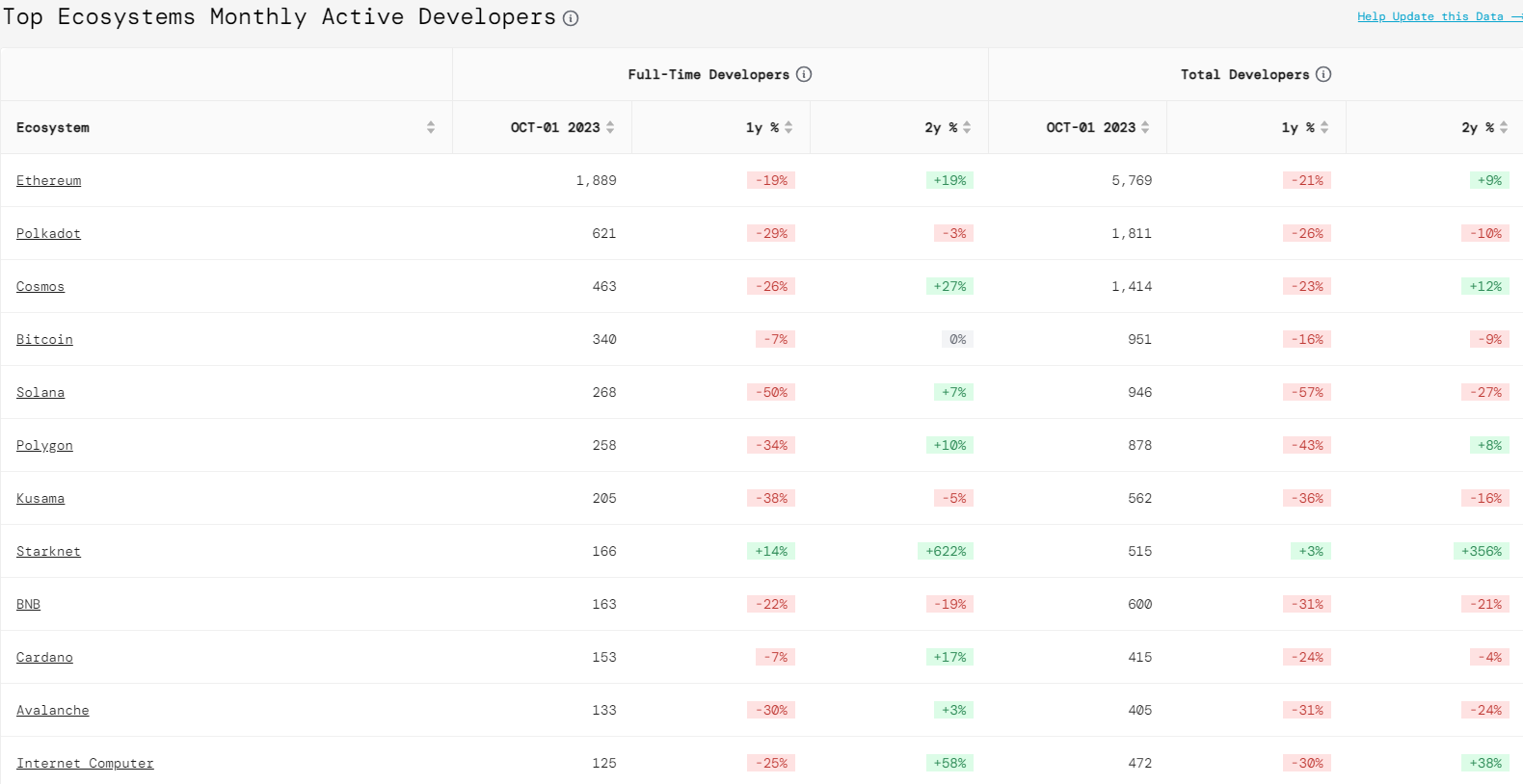 - 开发者数量较少。据 Developerreport 数据,当前 BTC 生态开发者数量为 340 人,仅排在全行业的第四名,远低于排名第一的以太坊 — — 活跃开发者数量为 1889 ,大约是 BTC 生态的 5.6 倍。而且这还是只是全职开发者的数量差距,算上兼职开发者,这一差距会更大。