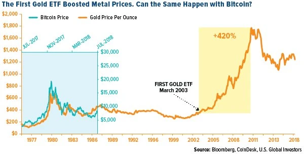在 2004 年推出黄金 ETF 后,五年内黄金的价格上涨了 420%,从这方面也能看出现货比特币 ETF 通过对比特币来说有多么重要。
