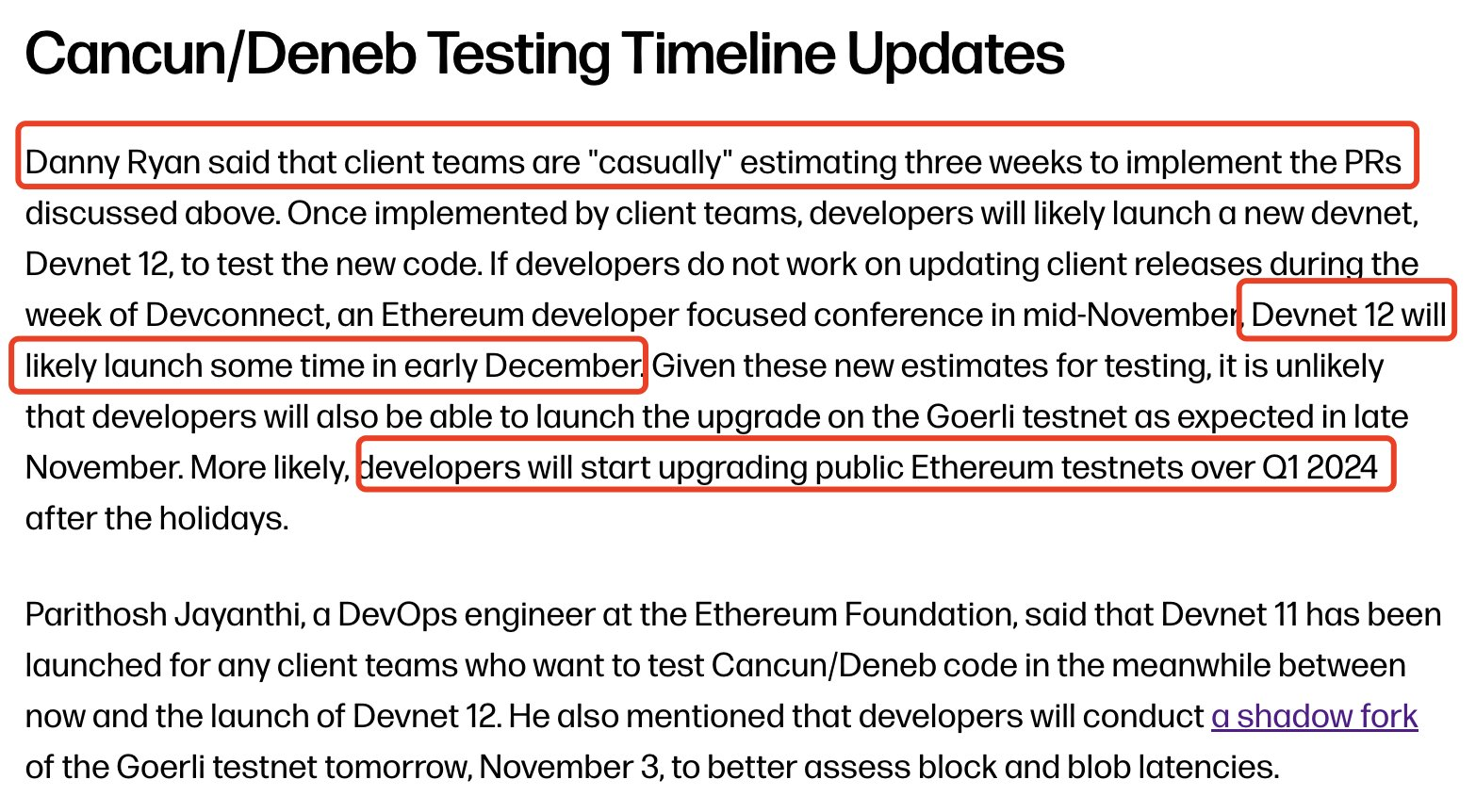 以太坊坎昆升级虽然在利好程度上比不上比特币减半,但是每次加密市场大牛市也离不开以太坊的功劳。最新的以太坊开发者会议纪要表示,开发者测试网 Devnet 预计在 12 月发布,公共测试网则在明年 Q1 发布,而上主网的时间则没有提到,估计最快也要明年 Q1 末或者 Q2 了。