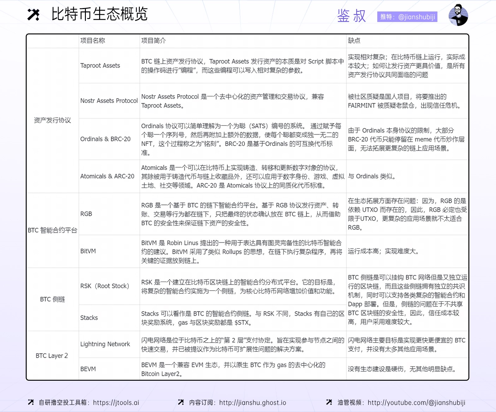 我们将比特币生态的主要项目总结成了一张表格,方便读者阅读。