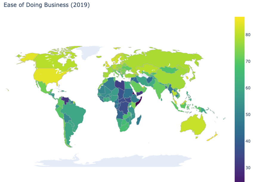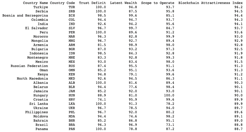 每个指标的“最佳”水平在很大程度上可以根据解释而有所不同,但我们认为它改进了仅针对一极端的简单方法。例如,完全缺乏国内信贷也可能意味着缺乏可支配的财富,这将不仅阻碍区块链产品,也会阻碍非区块链产品。同样地,更便利的营商环境可能意味着更大的运营范围,但极高的分数表示市场非常完善,可能已经通过现有解决方案得到足够服务。