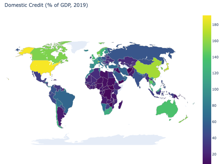 1. 指标:私人部门国内信贷占国内生产总值的比例(%),世界银行,2019年(除非根据最后报告的数据进行推断)