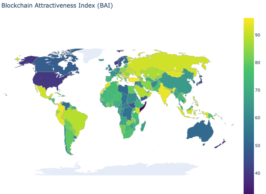 遗憾的是,并非所有人都可以理所当然地享有使用这些创新解决方案的权利。目前,在全球范围内,有几个国家禁止购买或使用加密货币,最引人注目的是中国,其他一些国家对此持有争议或存在监管不确定性。当前的情况不能被视为未来状态的可靠指标:对加密货币的限制可能会因政治和舆论的混合而年复一年地有所不同。然而,我们可以尝试通过使用对变革开放性和潜在颠覆性解决方案有利的代理指标来进行概括。我们还可以从消极的角度来衡量,优先考虑具有最少“浪费能量”的市场,其通过行政负担和类似的摩擦所衡量。