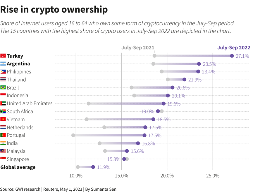 首先,我们看一下最近某些国家加密货币所有权的通胀关联增长,尤其是土耳其和阿根廷。在这些国家,尽管整个行业面临困难,使用量迅速上升,这表明用户在利益足够明确时愿意克服早期采用的障碍。