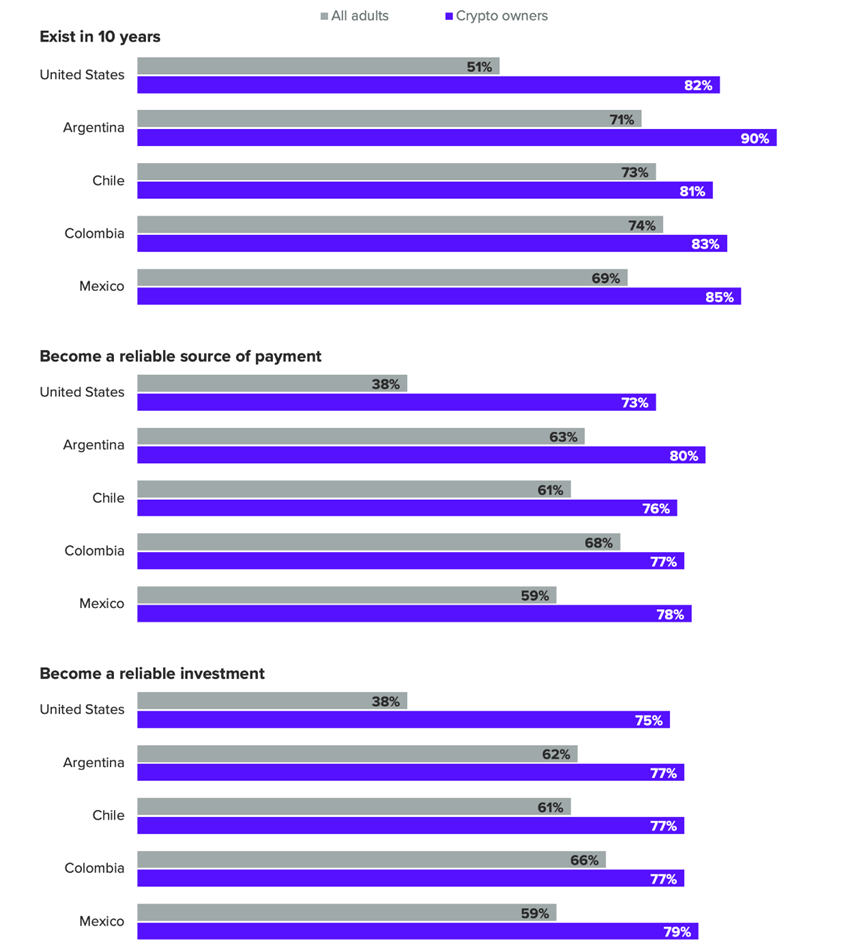 其他统计数据也支持通胀驱动假设,包括Deel Lab最近的一项研究,该研究发现拉丁美洲对加密货币支付的需求达到了创纪录的64%。在这方面,以加密货币为基础的薪资支付不仅可以抵御货币贬值,还可以提供流动性和进入全球市场的机会。拉丁美洲对加密货币的消费者情绪随着使用量的增加而提高,超过一半的受访者(包括68%的哥伦比亚人和63%的阿根廷人,但只有38%的美国人)认为加密货币可能成为一种可靠的支付形式。