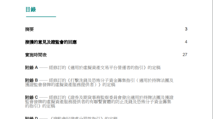 - 证监会于 2023 年 2 月 20 日发表《有关适用于获证券及期货事务监察委员会发牌的虚拟资产交易平台营运者的建议监管规定的谘询文件》。谘询期已于 2023 年 3 月 31 日结束。有关建议监管规定涵盖稳妥保管资产、认识你的客户的程序、打击洗钱/恐怖分子资金筹集、避免利益冲突、纳入虚拟资产以供买卖的准则、预防市场操纵及违规活动、会计及审计、风险管理,以及网络保安。