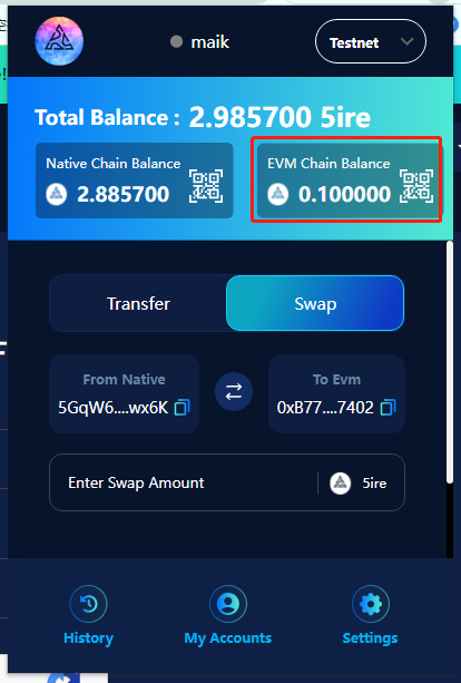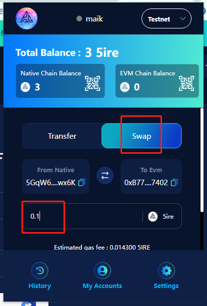 先打开5ire钱包,调换到**“swap”功能,复制native地址**