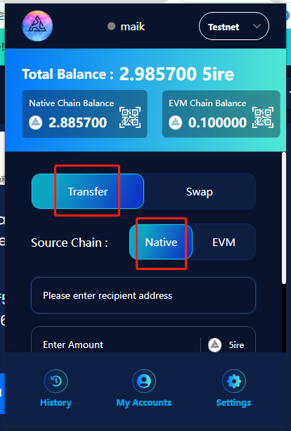 同样的我们进行“Transfer”转账功能,需要自己重建一个小号或者转给他人,选择对应的native地址或者EVM地址,这样我们就完成了整个交互