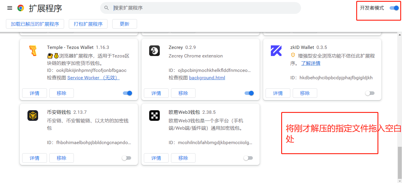 将解压的指定文件在“开发者模式”下拖入空白处完成5ire钱包插件扩展