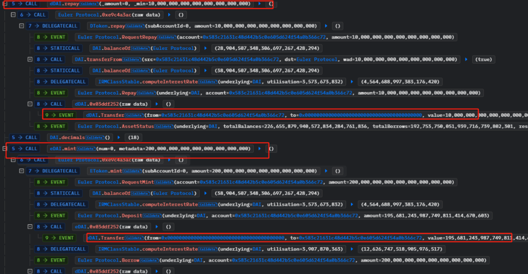 4.调用repay函数,用闪电贷剩余的10M个DAI偿还债务并且销毁了10M个dDAI,然后继续调用min函数借出195.6M个eDAI 和200M个dDAI。