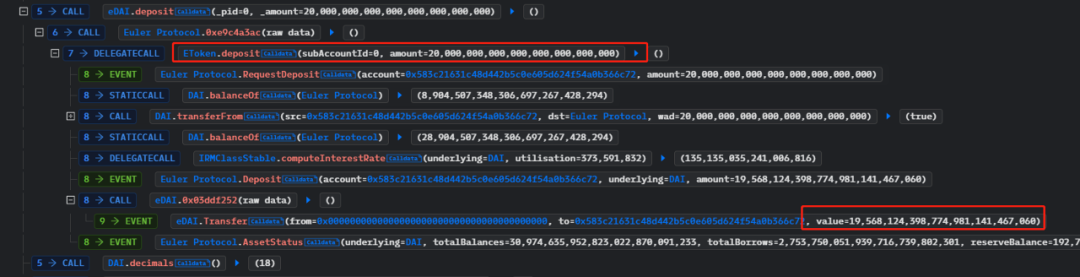 2.调用deposit函数将借来的Dai其中的20 M个质押到 Euler Protocol合约中获取了19.5M个eDAI。