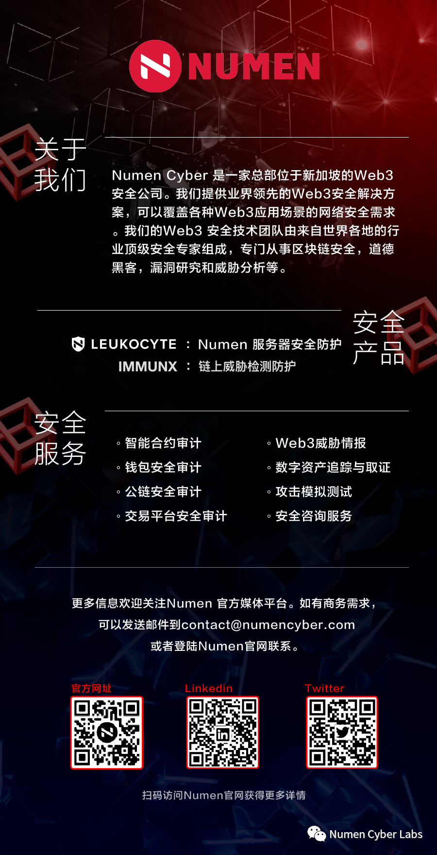 Numen实验室提醒项目方,合约在上线前要做好安全审计,保证合约安全性,对于借贷类项目需要特别关注资金偿还,流动性检测,债务清算等问题。Numen实验室专注于为WEB3保驾护航。