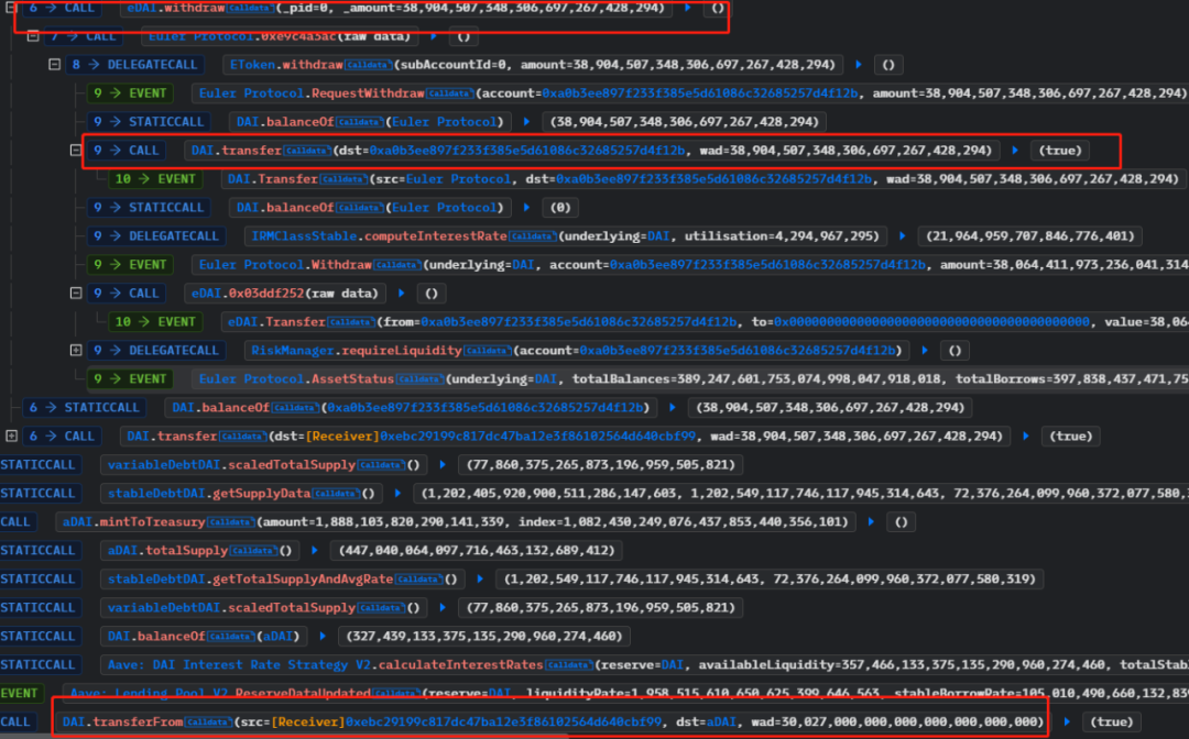 3.Euler Protocol可以调用mint函数借出10倍存款,此时黑客从中借出了195.6M个eDAI 和200M个dDAI。