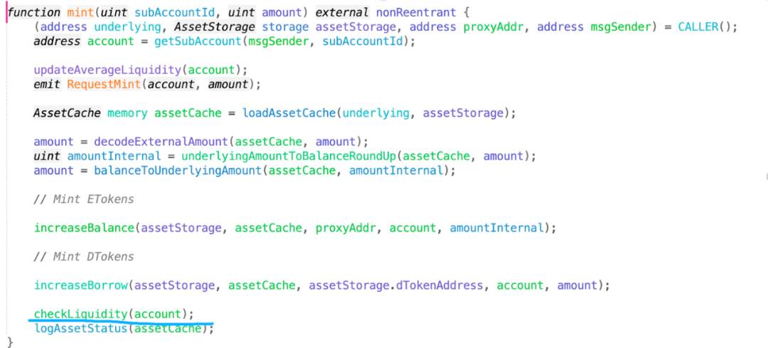 与下图的mint函数对比我们发现,donateToReserves函数少了一个关键步骤checkLiquidity。