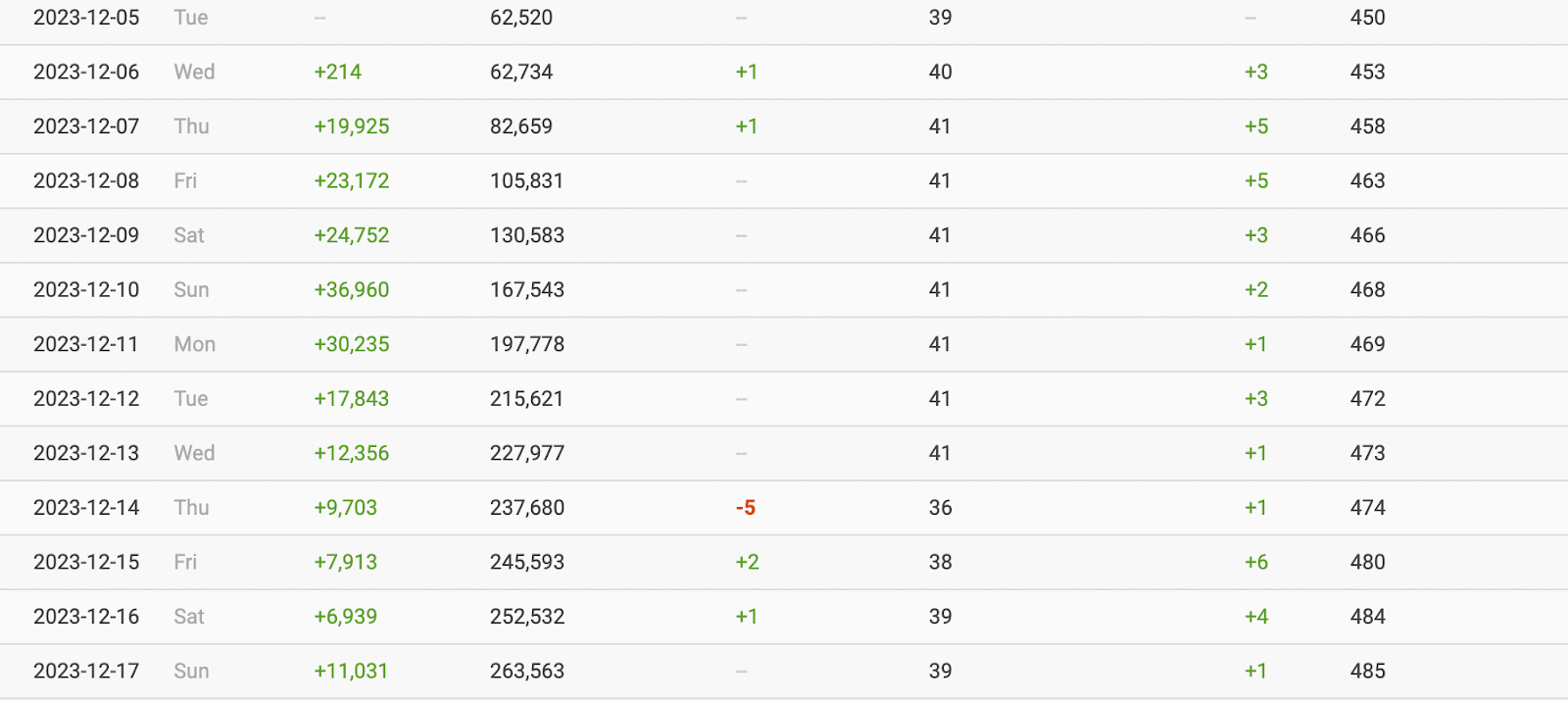排名第一的Trusta Labs一个月涨粉20W+,根据Social Blade, Trusta Labs是在12月7日左右出现了爆发式的增长。