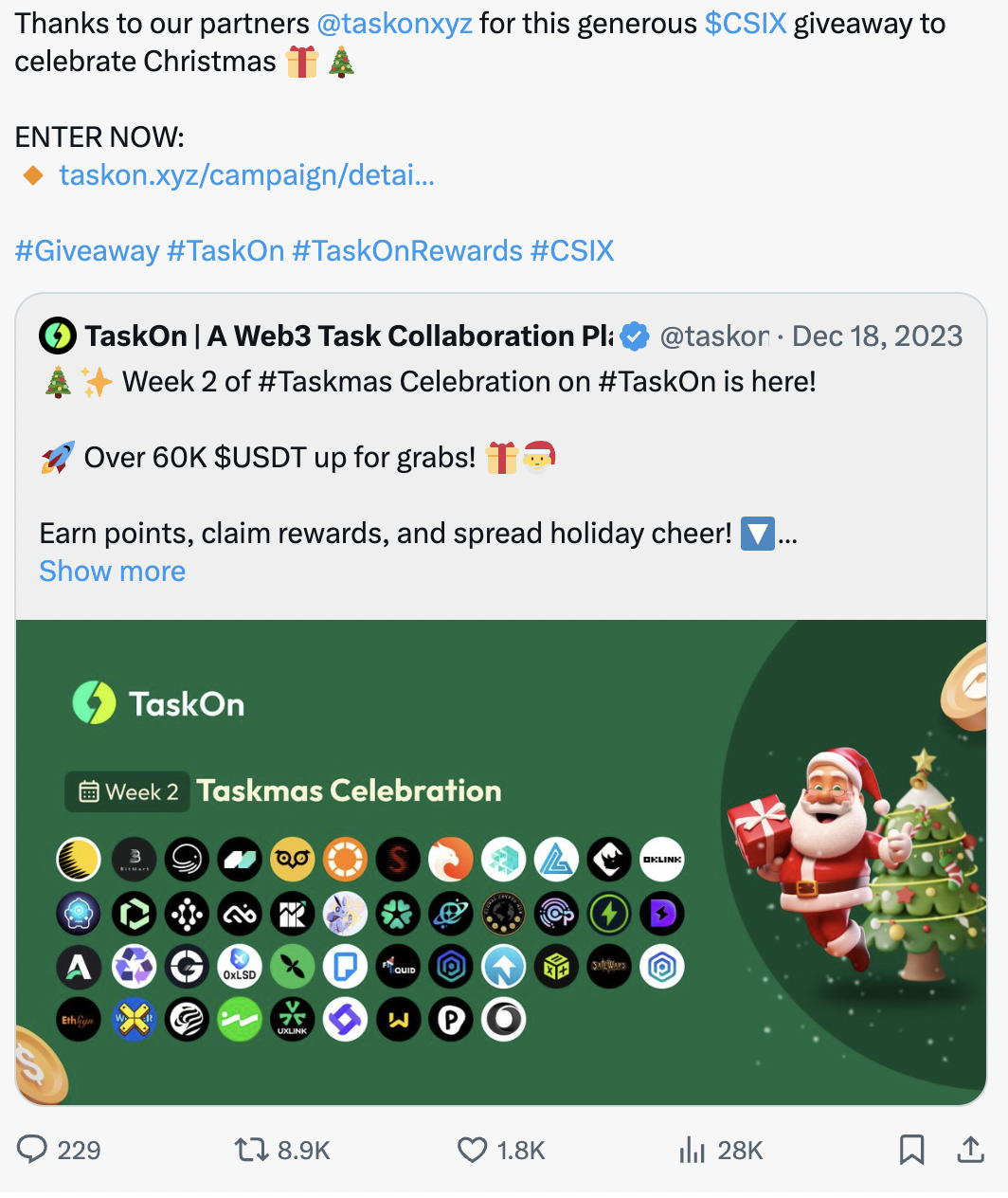 Carbon Browser一个月涨粉14W+,翻阅其推特动态,可以看到近一个月,曝光量最高的推特是和任务平台TaskOn合作的活动推特,得到了近9W的转发。