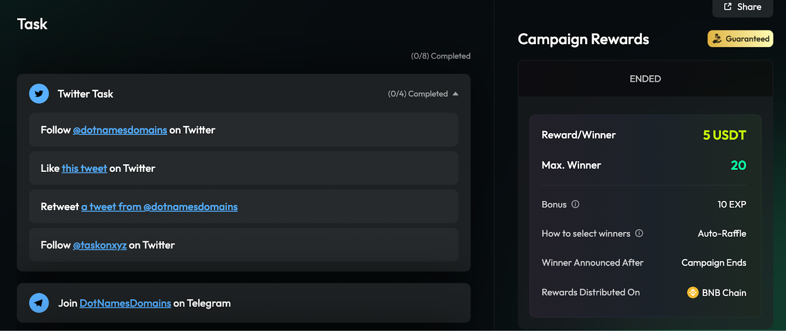 紧随其后的,Dot Names,选择双管齐下,在Galxe和TaskOn都发布了活动,任务简单,关注、点赞推特,参与活动人数众多。