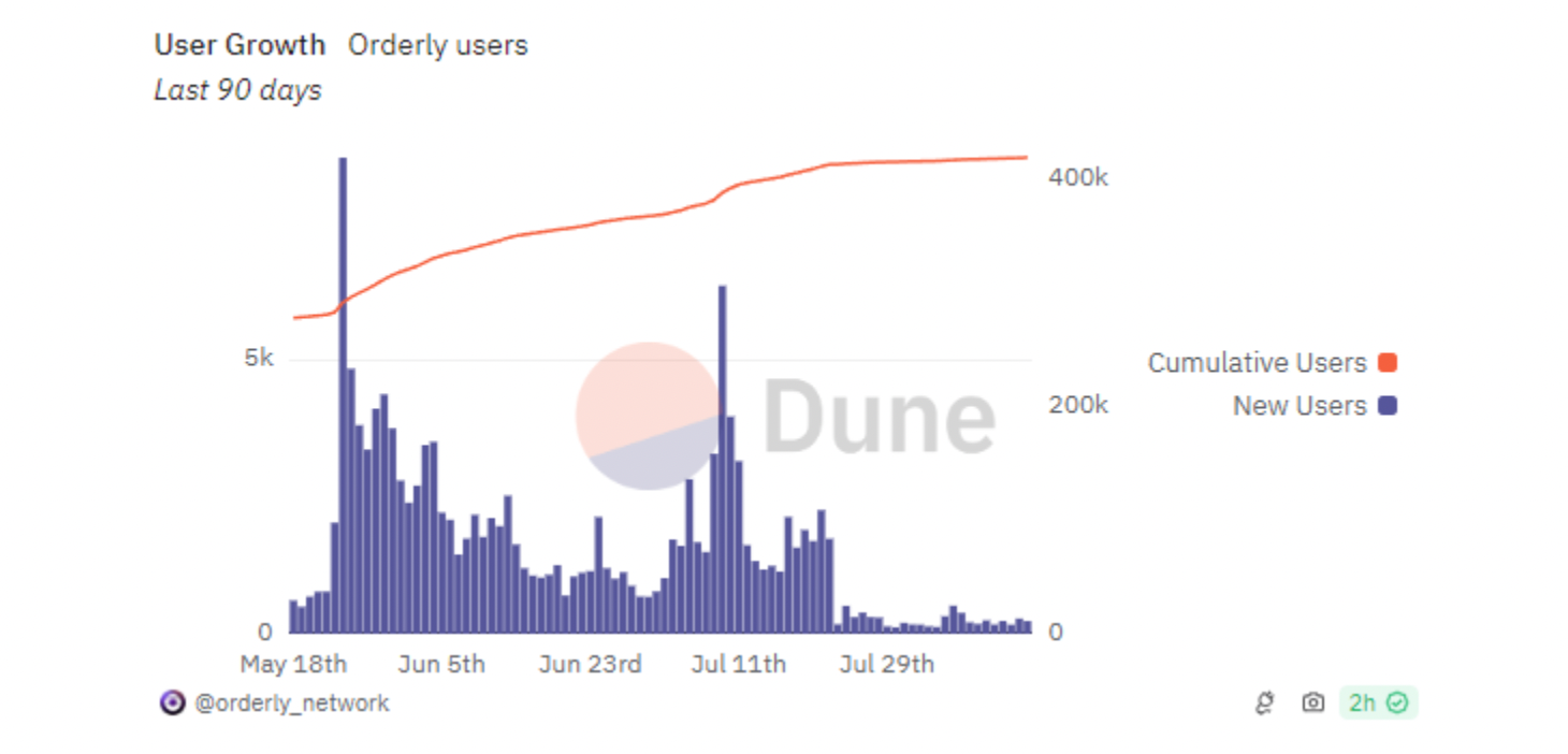 从用户增长和交易量的角度来看,Orderly Network的表现同样引人注目。在过去90天内,平台的用户数量持续增加,累计用户接近40万,反映出市场对该平台的高度认可和需求。