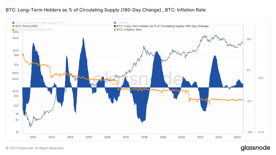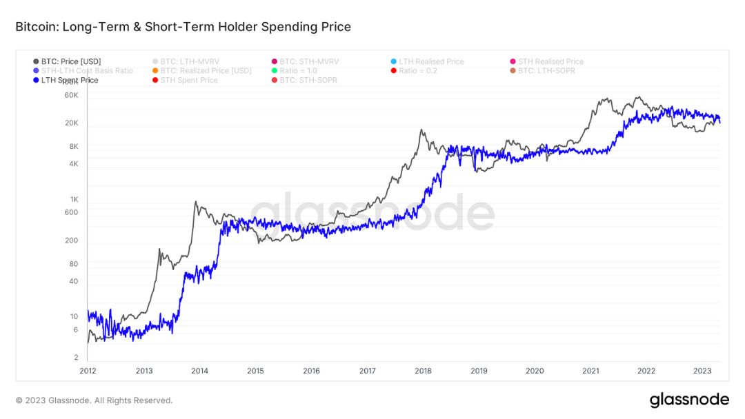在市场狂热上行期间,长期持有者流出的币量远大于每日发行量的总和,而在熊市深处则相反——持有者吸收的币量远大于每日发行量的总和。新发行的总和。两年来,我们一直处于净积累状态,同时在这个过程中,甚至出现了一个幻觉--整个衍生品行业已经被团灭,125x 合约的幕后大佬的头,已经被踩在地上反复摩擦。现如今的长期持有者拥有的大饼,在三箭资本爆雷时,或 FTX 破产时,都没有动过。