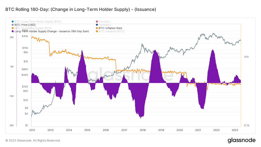 长期持有者倾向于在大饼呈抛物线式上涨时分配他们的筹码,然后在价格调整后开始重新增持。我们可以看看长期持有人的消费习惯,看看长期持有人供应的变化是如何最终帮助价格在抛物线上涨后降温的。下面,我们衡量长期持有者的 180 天净变化减去市场新供应发行的 180 天总和。
