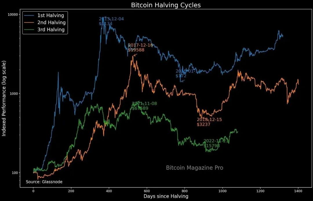 过去的十几年,大饼价格在每次减半后都大幅上涨,尽管都是发生在减半结束后的好几个月。每一个减半周期,都会有关于减半预期是否已经体现在价格上的争论--毕竟减半是一个众所周知的事情。