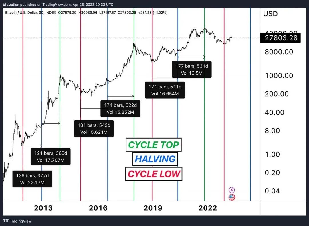 也许以前的市场周期最令人印象深刻的是,从周期低点到减半,以及从减半到周期高点,市场的时间是那么相似。周期与周期之间的对称性是相当显著的。