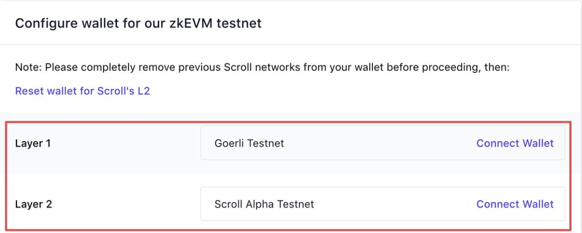 步骤4: 使用它们的Hop fork将以太坊Goerli测试网桥接到Scroll Testnet:http://scroll.io/alpha/bridge。