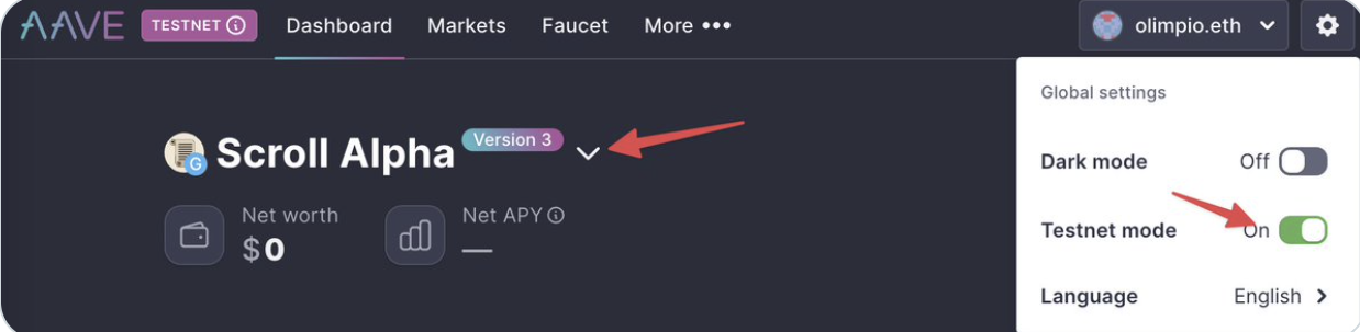 步骤6:让我们尝试Aave的新Scroll Testnet。访问http://app.aave.com并启用“测试网模式”