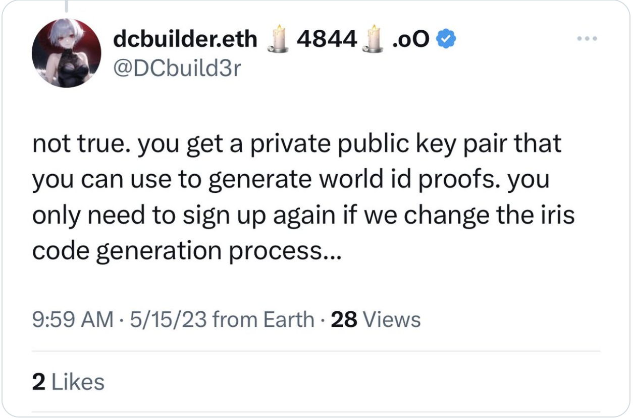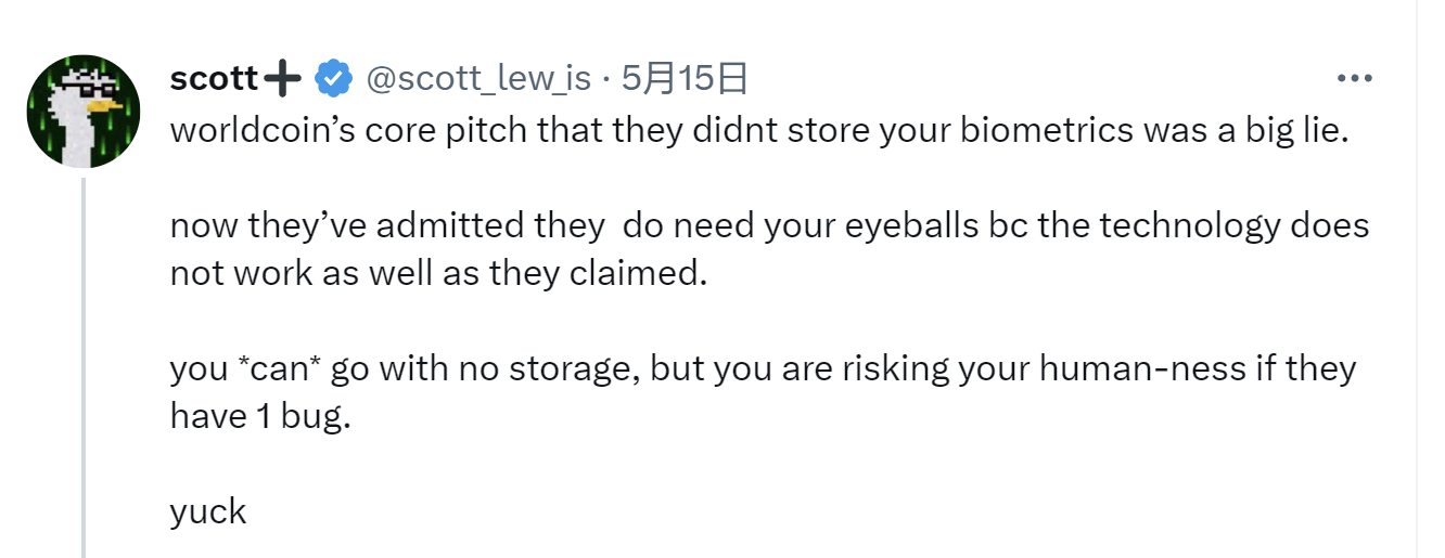 @scott_lew_is认为,如果用户选择不将其生物识别信息交给Worldcoin 保管“他们需要更改流程 [可能是为了响应错误],您将失去眼球卡并被迫重新申请”。