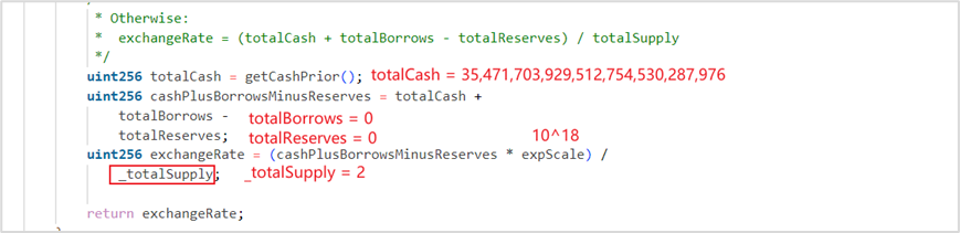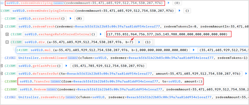 (2)计算精度问题:利用计算过程中的精度损失以及被修改的exchangeRate,在只抵押了1wei soVELO的情况下,可以赎回35M VELO
