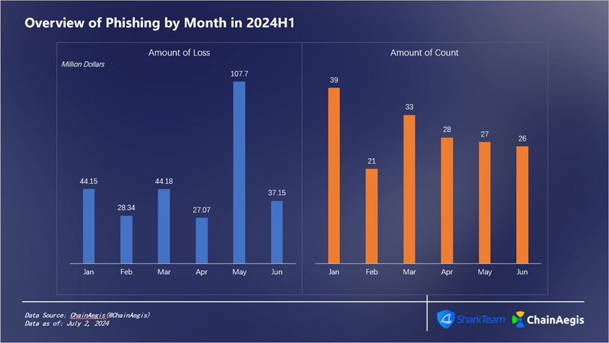 如下图(图9)所示,钓鱼攻击在1月发生频率最高共39起,造成损失金额约4415万美元;2月发生频率最低共21起,造成损失金额约2834万美元。5月虽然钓鱼事件仅发生27起,但造成损失金额为上半年历月最高,达到1.08亿美元。其中,2024年5月3日,有用户因地址污染钓鱼手法被钓鱼1155WBTC,价值超过7千万美元。
