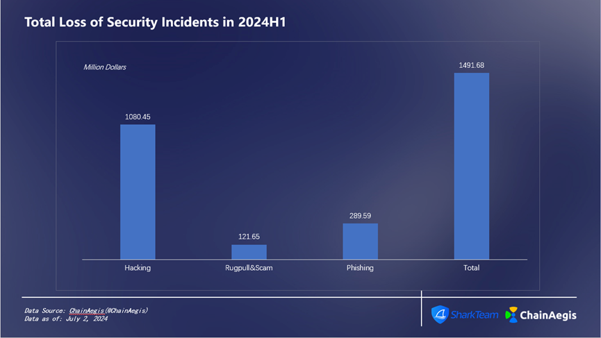 与2023年上半年相比,2024年上半年因黑客攻击、项目方Rugpull、钓鱼诈骗等造成的总损失有大幅上升,达到了14.92亿美元。总体而言,Web3 安全领域形势十分严峻。