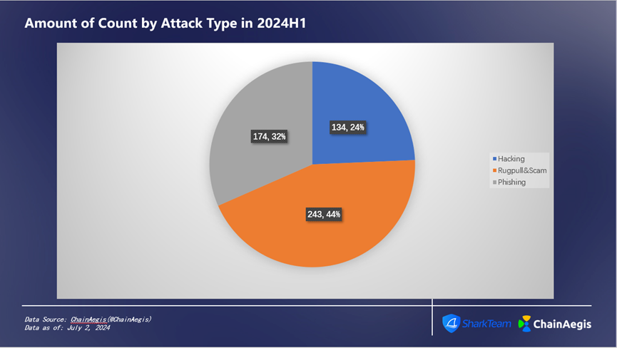 Rug Pull在上半年总共发生243起,同比2023年H1共61起激增331.15%,损失金额增加258.82%,共计1.22亿美元,占整个H1损失金额的8%。
