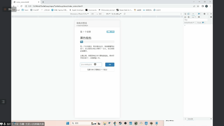 线上赛道的真格基金专项奖颁给了海龟洋葱汤。盏灯工作室利用 GPT 的对话能力,构建“海龟汤”故事知识库,让 AI 担当主持人,大幅度提升玩家提问自由度,制作了一个人也能玩的“海龟汤”对话解谜游戏,最大程度降低了游戏游玩门槛和落地成本,提供了一套可商业化的技术方案。