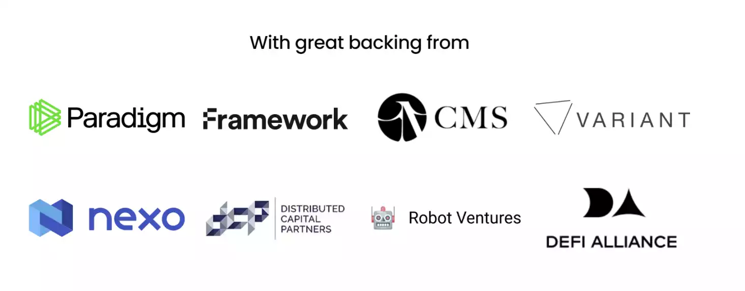 由 Delphi Digital 领投的 500 万美元种子轮融资,其他主要投资者包括 StarkWare、Three Arrows Capital、Genesis Block Ventures、Alameda Research、CMS、MetaCartel DAO、DCVC、Amber Group、TPS Capital、Ascensive、D3Web Capital、4RC 和 SkyVision Capital,以及其他天使投资者等。