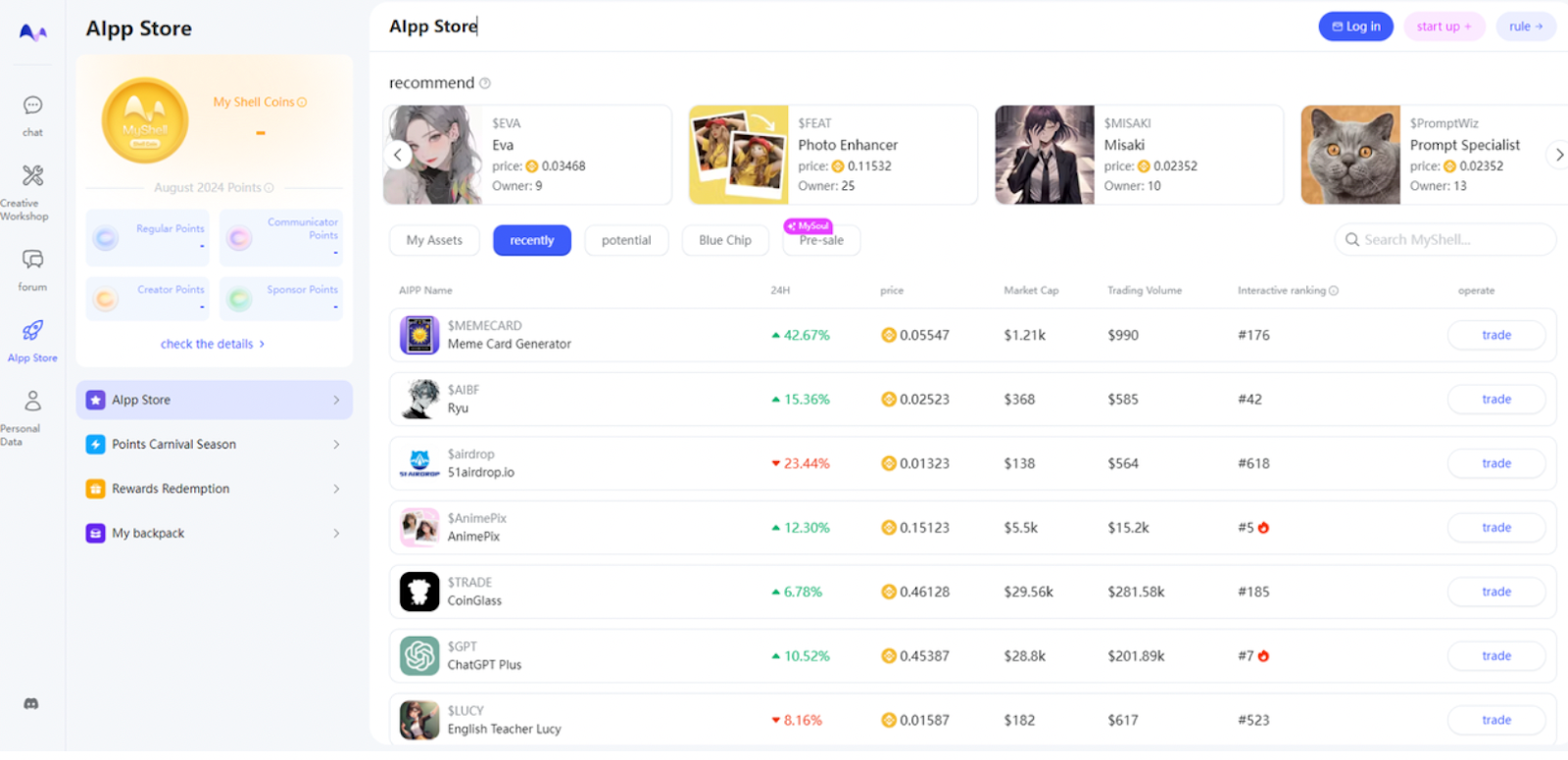 MyShell 推出的 AI 应用商店(AIpp Store)是其生态系统的重要组成部分,旨在通过经济激励促进 AI 应用的发现与传播。AIpp Store 允许用户将他们开发的 AI 应用封装为可在链上交易的“AIpp”,并通过预售和公售的方式向市场开放。这一交易系统首次引入了加密货币的经济激励机制,使得创作者不仅能够通过积分奖励获得收益,还可以通过应用的市场表现获得直接的现金流回报。