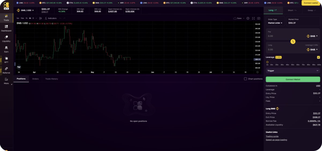 BFX Finance是一个基于 BNB Chain 的永续合约去中心化交易平台。BNB Chain 是 Binance Smart Chain (BSC) 上的一个独立区块链,可以支持高性能、低成本的交易和智能合约执行,并且具有与 BSC 相同的生态系统。